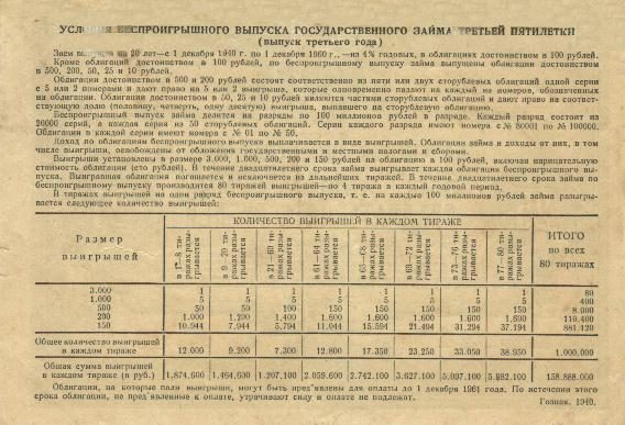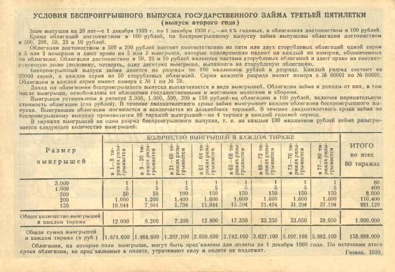 Как понятно из этого документа, было два вида займов: беспроигрышный и процентный. Т.е. государство брало у населения взаймы деньги на 20 лет и расплачивалось за это или процентами каждый год в размере 4% годовых или выигрышами, где облигация выступала лотерейным билетом. Причем выиграть должна была каждая облигация за 20 лет, для этого розыгрыши проводились по 4 раза каждый год, а размер выигрыша был уже делом случая. По истечении срока облигация выкупалась государством по нарицательной стоимости. В итоге людям возвращались все средства + проценты или выигрыши. То есть ни каким грабежом займы не являлись, а вполне выгодным финансовым вложением.