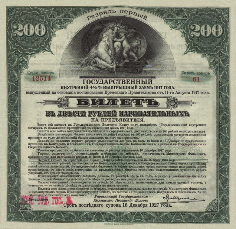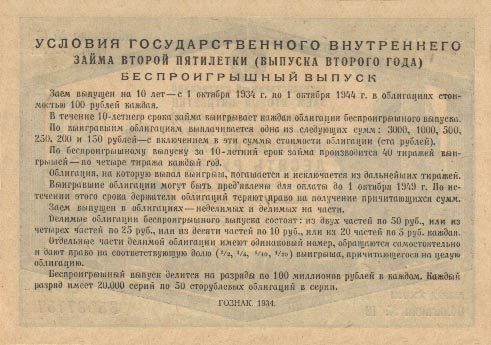 Облигации достоинством в 500, 300 и 200 рублей состоят соответственно из пяти, трёх и двух сторублёвых облигаций с пятью, тремя и двумя номерами и дают право: а) по беспроигрышному выпуску — на пять, три и два выигрыша, которые одновременно падают на каждый из номеров, обозначенных на облигации, б) по процентному выпуску — на процентный доход со всей нарицательной стоимости облигации.