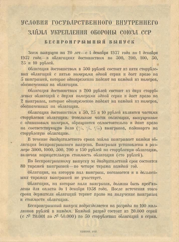 Облигации беспроигрышного выпуска, на которые пали выигрыши, могут быть предъявлены для оплаты до 1 сентября 1957 г.; по истечении этого срока держатель облигации теряет право на получение выигрыша и стоимости облигации.Доход по облигациям процентного выпуска выплачивается один раз в год в размере 4% — по купонам, сроки которых наступают 1 сентября каждого года, начиная с 1 сентября 1937 года.Выкуп облигаций процентного выпуска начинается с 1 сентября 1952 г. и производится в течение пяти лет (1952, 1953, 1954, 1955 и 1956 гг.) равными частями ежегодно. Держателям облигаций выплачивается при выкупе нарицательная стоимость облигации.