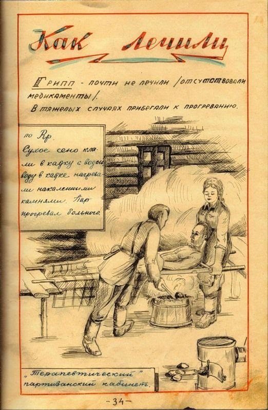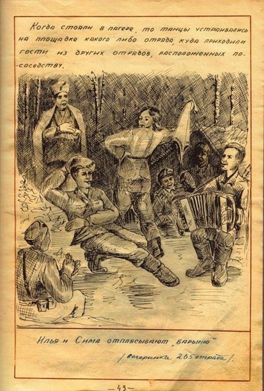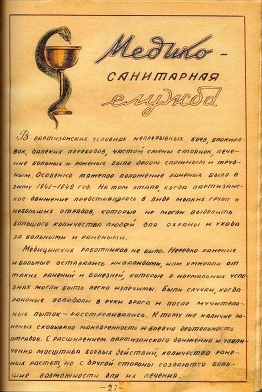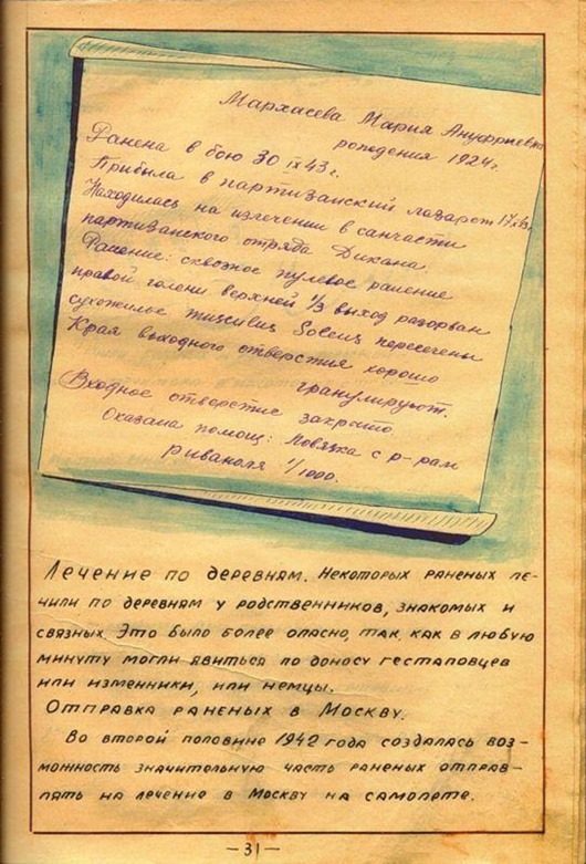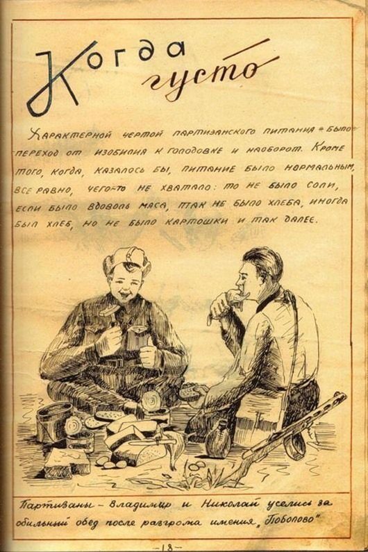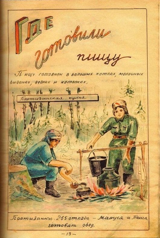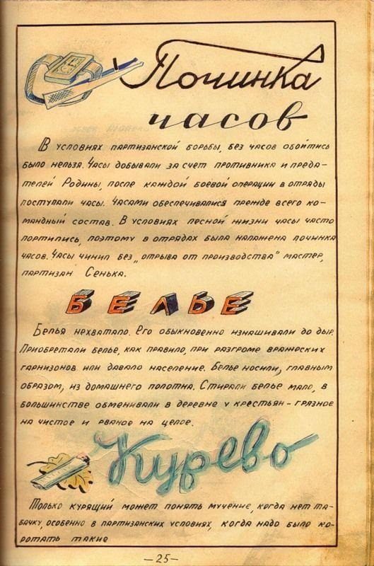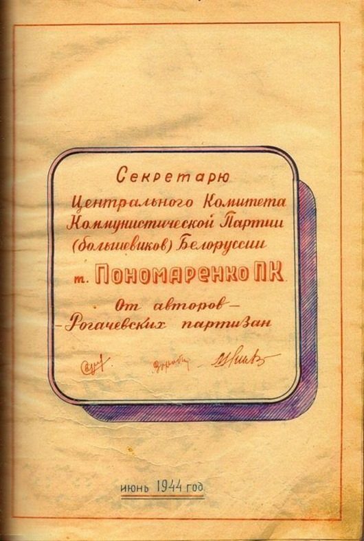 журнал был написан уже после освобождения Белоруссии. Уж очень тщательно и красиво оформлен. Вряд ли во время оккупации у партизан было время разводить художества. И, кстати, заметили, как повязаны платки у женщин-партизанок? Именно так по традиции повязывают платки белорусские крестьянки)))