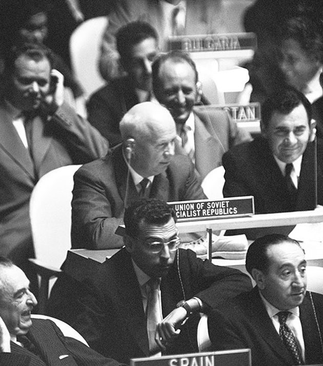 Этот известный случай породил сразу несколько мифов: во-первых, колотил по столу Хрущев не ботинком, а открытой туфлей. Во-вторых, многие думают, что все произошло у трибуны. На самом деле Никита Сергеевич не выступал, а сидел в зале вместе со всей советской делегацией. Версий, почему Хрущев вдруг решил барабанить по столу на заседании Генеральной Ассамблеи ООН, несколько.