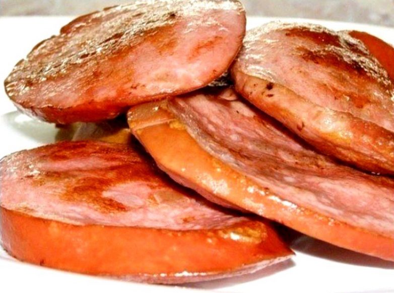 Даааа, нынче так колбасу уже не пожаришь, она просто тупо приклеивается к сковородке а не жарится. Вобщем-то сейчас от колбасы нормальной лишь названия остались