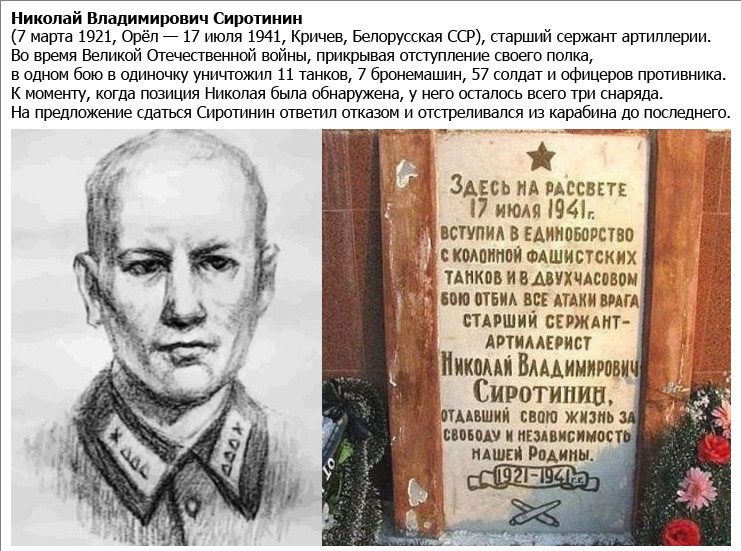 Танки Гудериана уперлись в Колю Сиротинина, как в Брестскую крепость. Уже горели 11 танков и 7 бронетранспортеров! То, что больше половины из них сжег один Сиротинин, — точно (какие-то достала и артиллерия из-за реки). Почти два часа этого странного боя немцы не могли понять, где окопалась русская батарея. А когда вышли на Колину позицию, были очень удивлены, что стоит только одно орудие. У Николай оставалось всего три снаряда. Предлагали сдаться. Коля ответил пальбой по ним из карабина.