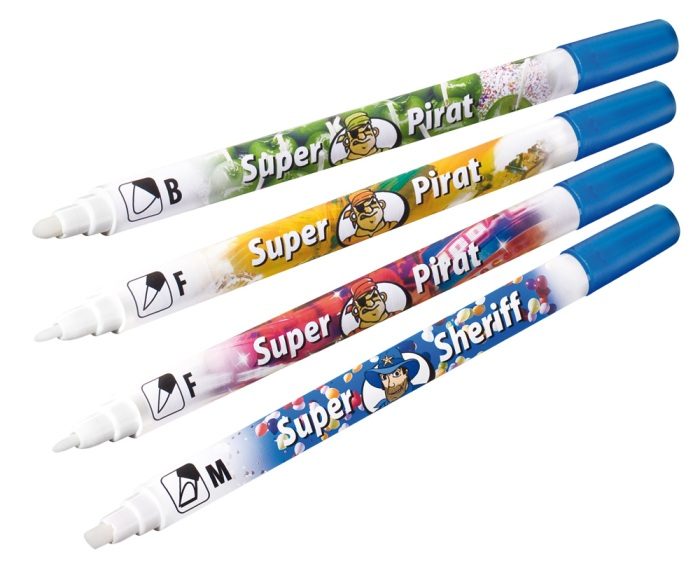 Мои совковые ручки абсолютно не котировались, все писали в основном перьевыми. Школьные письмена ими получались на бумаге красивыми и сочными. Да и как оказалось, при использовании их, была крутая возможность отредактировать написанное одним девайсом, который все звали «тинтой». Название этого девайса происходит от немецкого слова «tinte», то бишь «чернила». На самом деле это был простой «tintenloscher» (дословно с немецкого — «стиратель чернил»). Он был похож на фломастер с двумя концами. Одним концом стираешь, другим концом исправляешь, потому что чернила на исправленном месте наноситься далее не будут, ибо на бумаге остается химия, которая выводит чернила. Исправленное место конечно было видно, но не явно, хоть и по цвету исправленного все же было расхождение. Но тем не менее, это не было порчей бумаги при редактировании всяких ляпов с помощью бритвы, ластика, замазки и прочими топорными средствами. Запомнились мне такие «стиратели чернил» — Super Pirat, Tip-Top, Super Sheriff. Эти изделия и сейчас производят.