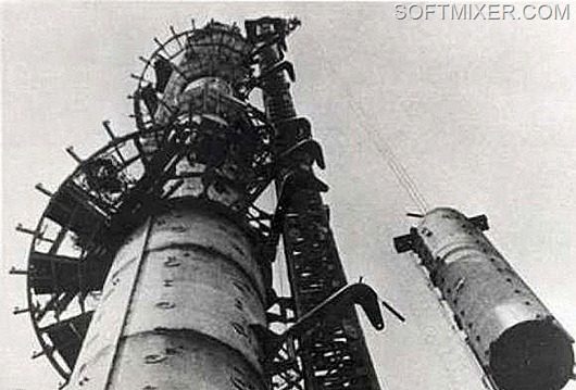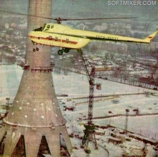 Потом секции антенны вновь разобрали, и отдельные их части — царги — подавались краном на перегрузочную площадку на высоту 63 метра. Затем специальным краном, установленным на стволе башни, первые царги поднимались на вершину башни и монтировались так, что они вошли внутрь ее ствола на 10 метров. А после этого монтаж вели с помощью ползучего крана.