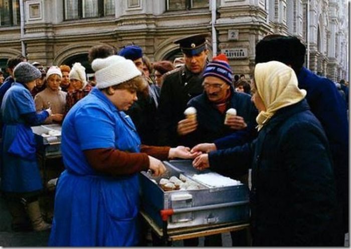Вообще-то, многие цены не верны, пример с мороженным: «сливочное, в вафельном стаканчике, с кремовой розочкой, стоило 19 копеек. 15 коп. — сливочный „Рожок“, и сливочный брикет в вафле, а вот пломбир, стоил 48 коп.(очень дорого), но и пачка была большая. Фруктовое, в бумажном стаканчике — 7 коп., а цитрусовое, в таком же стаканчике — 9 коп. но оно появилось позже. Ещё был „мороженное торт“, весь в розочках, точно не помню сколько стоил(ел один раз), но, примерно 1руб.15коп. И ещё, здесь показаны одни пустые и полупустые прилавки, это не правда(я про Москву). Прилавки опустели, причём полностью, только при Горбаче-Меченом, вот это была жесть, „торжество победившего Социализма“ в своём апофеозе… В общем, как-то так… Если есть вопросы, спрашивайте, отвечу. Напоминаю, я писал о Москве.