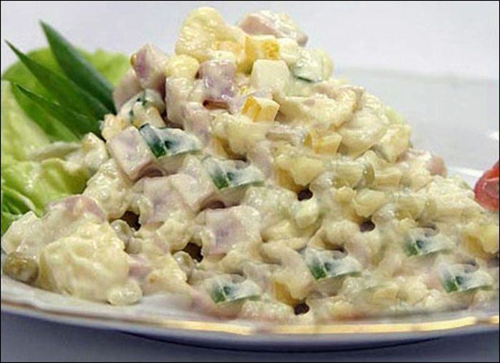 Салат оливье под майонезом но не с мясом как в оригинале а с вареной колбасой,