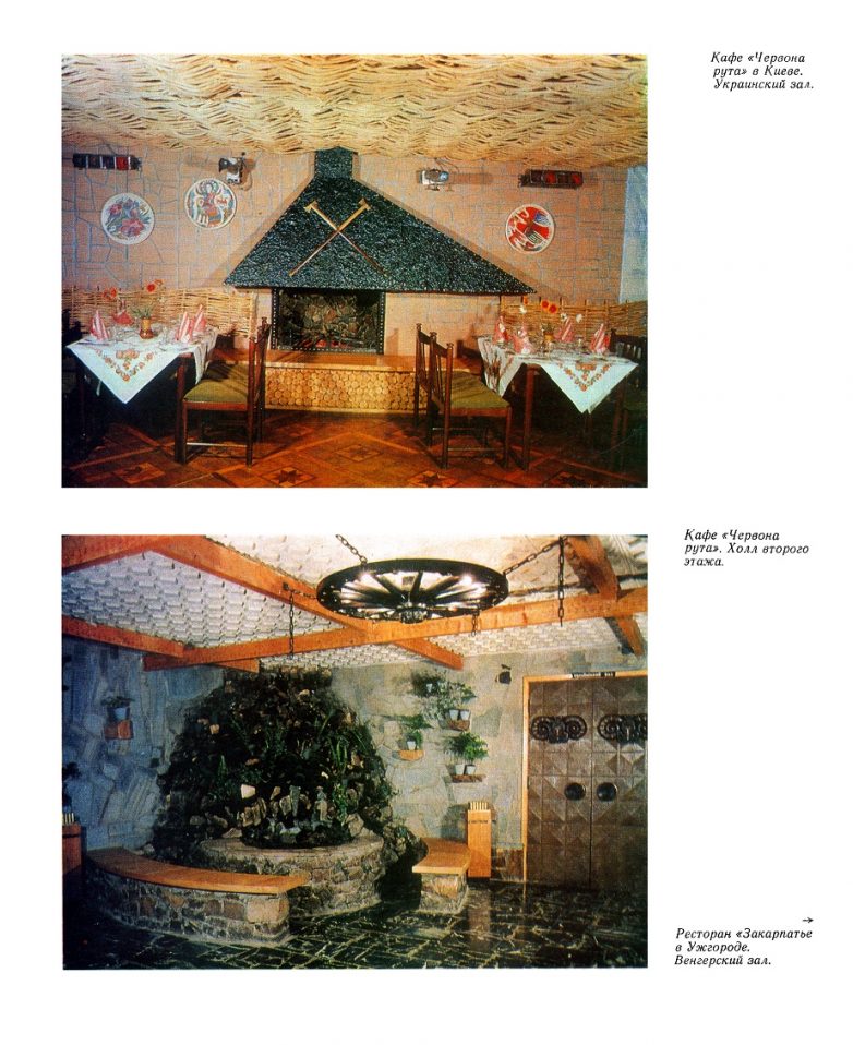 Но при этом зачастую казёнщина одерживала верх, и несмотря на все старания, интерьер ресторанов до боли напоминал Ленинские комнаты и Красные уголки. Иногда всё это выглядело просто убого и откровенно отталкивающе. Это не удивительно, ведь художники-оформители учились в основном по этому профилю, и подсознательно все штампы вылазили наружу, как не пытались их вытравить и забыть.