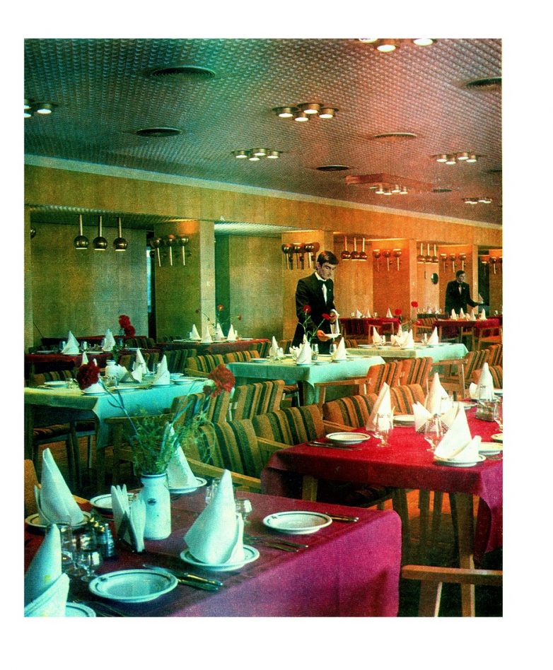 — Рестораны, открывшиеся в 50-60 годы. Они, как правило, совсем не интересны — часто это были т.н. «стекляшки», большие окна-витрины, кресла-ракушки, столики на тоненьких ножках…