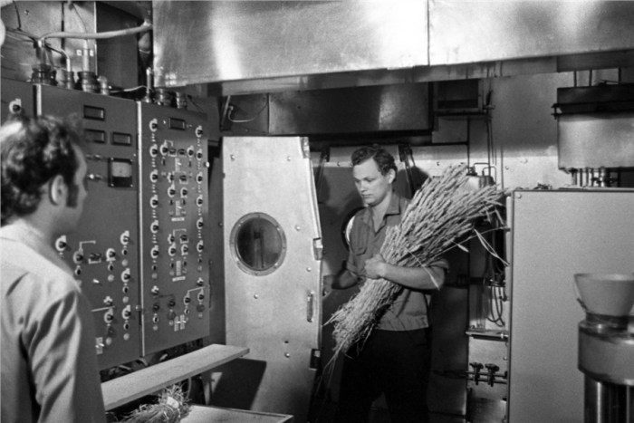В установке «БИОС-3» с собранным урожаем пшеницы. Готовят обмолот в специально сконструированной для этого эксперимента мельнице, фото 1973 года.