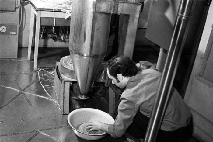 Получение муки из зерна, выращенного во время научного эксперимента на установке «БИОС-3»Помолом муки занимается Геннадий Асиньяров, фото 1973 года.