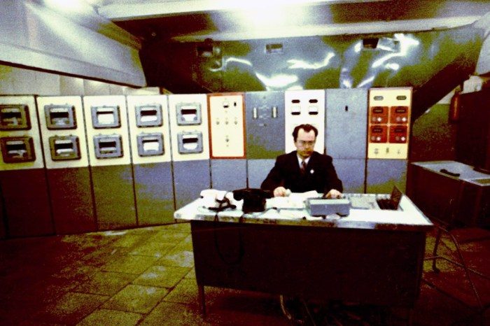 Связь с внешним миром участников эксперимента на установке «БИОС-3» осуществляет Николай Петров с помощью переговорного пульта, фото 1973 года.