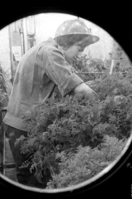 Участники эксперимента на экспериментальной установке «БИОС-3» приготовлением очередного обеда. Установка представляла собой замкнутую экологическую систему жизнеобеспечения с автономным управлением, фото 1973 года.
