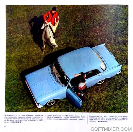 «Безотказность в эксплуатации, простота обслуживания, экономичность, надёжность, скорость, комфортабельность и элегантность — вот качества советского легкового автомобиля „МОСКВИЧ“».