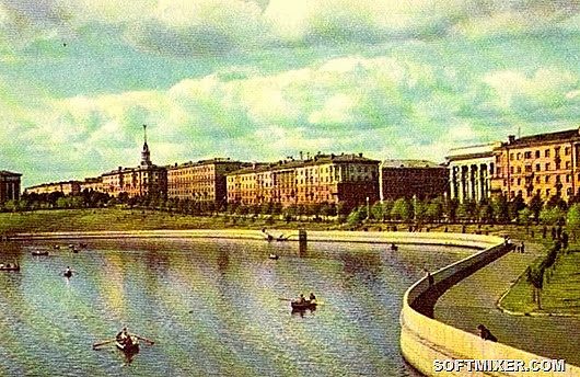 Набережная Свислочи. Второе здание справа (с колоннами) — телецентр. Дальше — шпиль. Крайнее слева здание — штаб белорусского военного округа — ныне Министерство обороны.