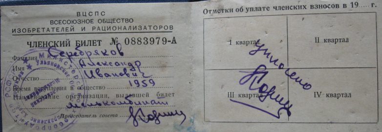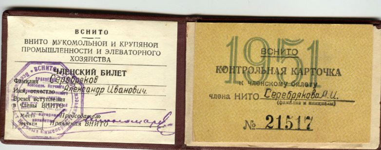Билет члена Всесоюзного общества изобретателей и рационализаторов выданный Серебрякову.