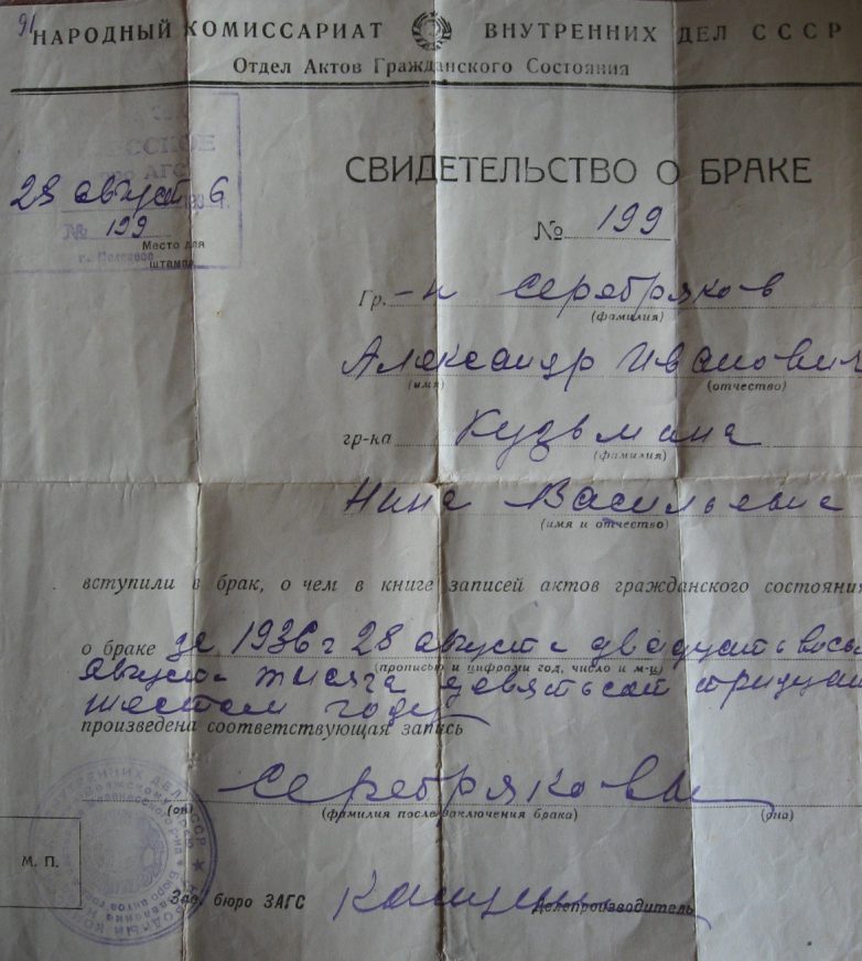 Свидетельство о браке выданное Александру Ивановичу Серебрякову и