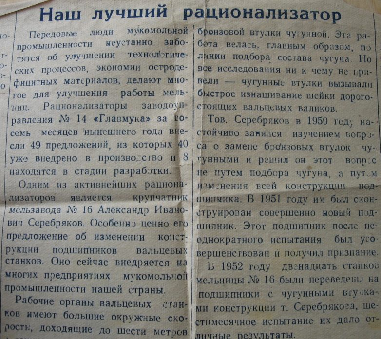Статья из заводской многотиражки Мельзавода №16 о достижениях рационализатора Серебрякова.