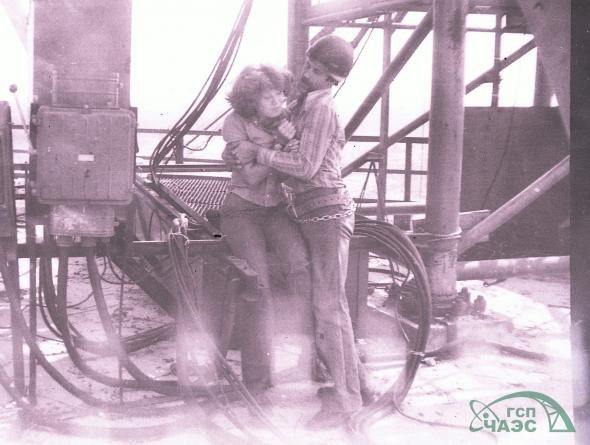 Монтажники–высотники. Сзади на фото виден стоящий напротив 2 блока погрузочный барабан, осуществлявший выгрузку топлива в вагон–контейнер.