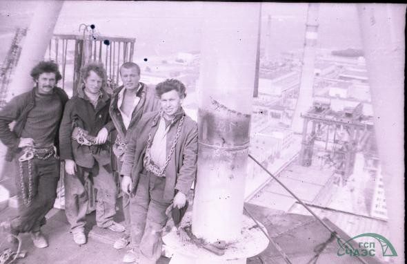 Члены сводной бригады. Все оснащены страховочными поясами, цепями и карабинами для работы на высоте. Один из работяг предположительно держит в руках рацию для связи с крановщиком.