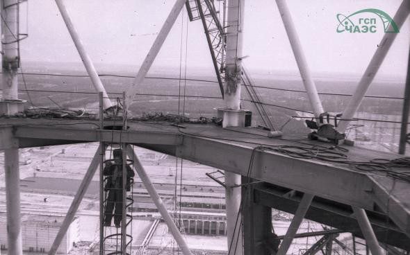 Строители. Похоже, крюк крана перекрыл вид на юную Припять.