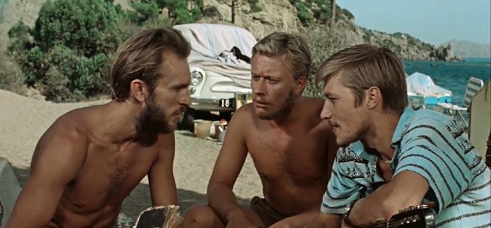 Немудрено, что при столь бесчеловечных раскладах морского отдыха прогрессивная часть советского человечества выбирала «дикий» отдых. Бросаешь в багажник палатку, акваланг, недельный запас тушенки — и ты человек свободный, как морской бриз!Самым известным кинофильмом про такой отдых стал фильм «Три плюс два» снятый в 1963 году. Три молодых товарища благоустраиваются на безлюдном пятачке у Черного моря, и все бы отлично, но идиллию нарушает «Запорожец» с двумя девушками, претендующими на тот же самый клочок суши.