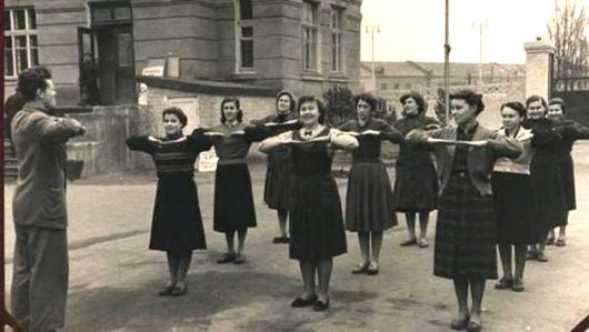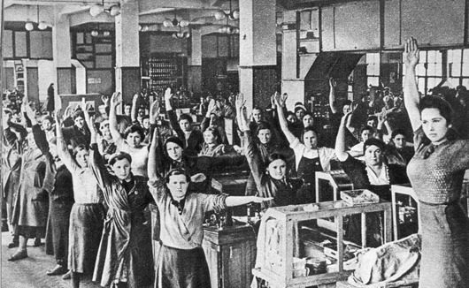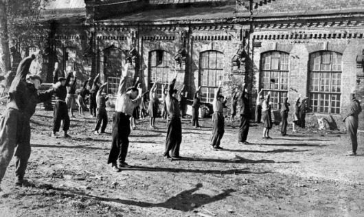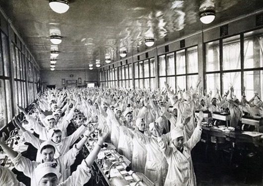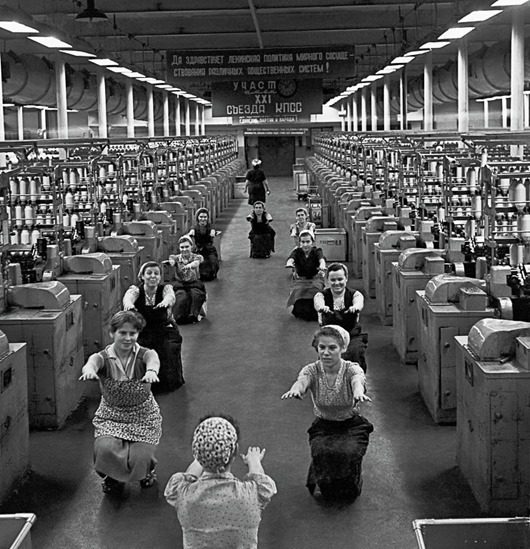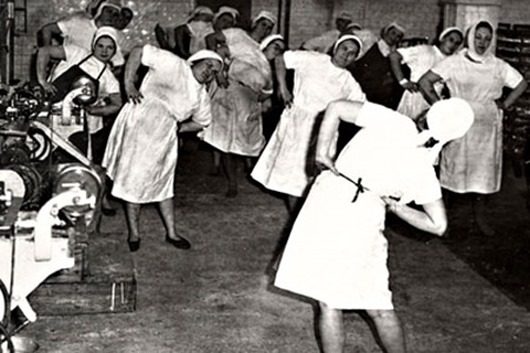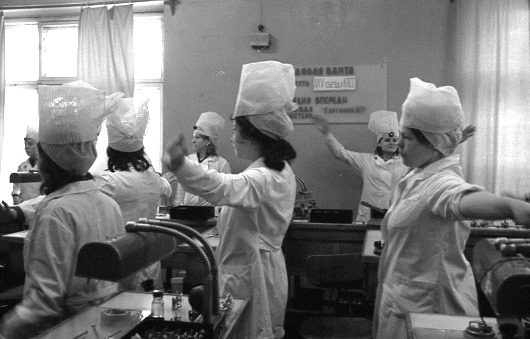Производственная гимнастика представляла собой набор элементарных упражнений направленных на повышение работоспособности и предупреждения утомления, так как люди проводящие время в одной и той же позе (товарищи, внимание, это ведь и к нам относится) страдают из-за этого профессиональными заболеваниями. Комплекс же различных упражнений позволял им размяться.