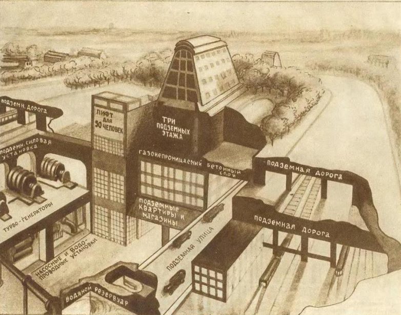 "… вместительные лифты спускают жителей в подземные дома, защищенные сверху мощным слоем бетона. Турбогенераторы и насосные станции снабжают подземные жилища светом, теплом, воздухом и водой. Если весь проект несбыточен, то это нельзя сказать об отдельных его деталях. Так, например, проблема частичного переноса городского движения под землю разрешается не только устройством метрополитена, но и сооружением целых подземных улиц и автомагистралей", — писали авторы «Техника — молодежи» в январском номере за 1937 год.