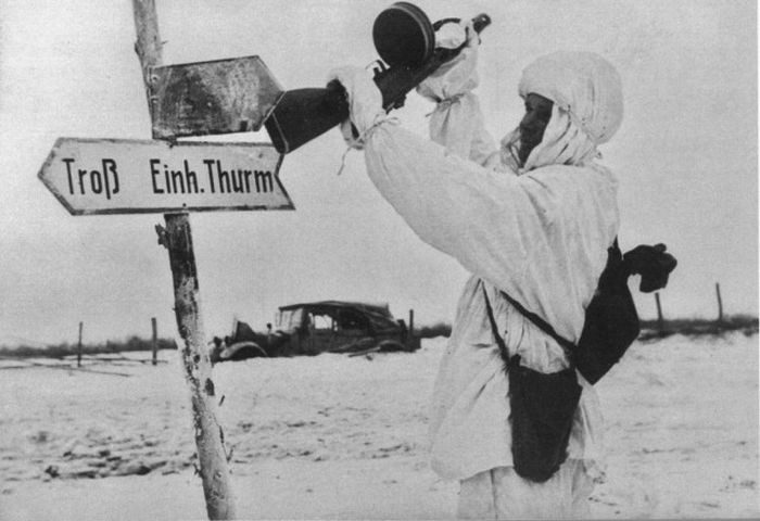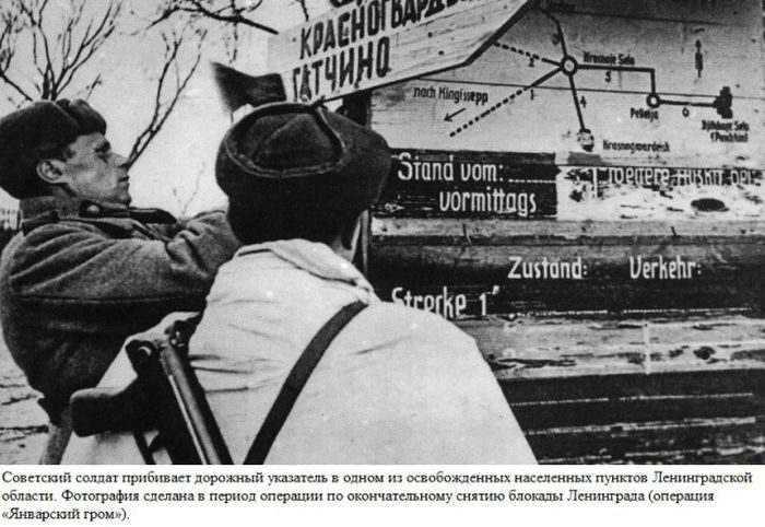 Советский солдат сбивает со столба немецкий дорожный указатель — под Ленинградом он больше не нужен