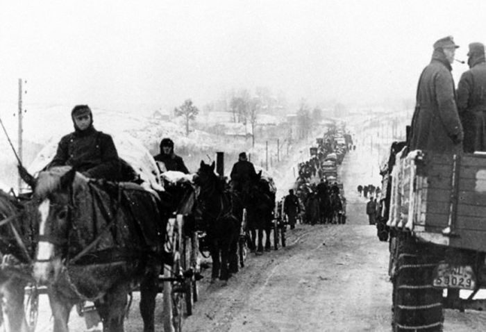 Лозунг над прифронтовой дорогой недалеко от Ленинграда и советские войска на марше. Январь 1944 года