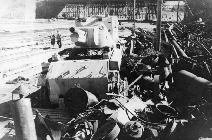 Через несколько месяцев после окончания битвы за Ленинград. Немецкая техника, подготовленная к отправке на переплавку