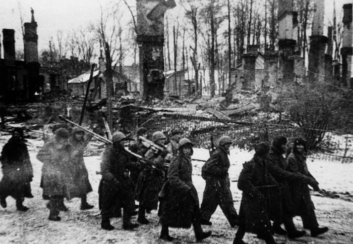Советская пехота входит в Гатчину (на юг от Ленинграда). Немцев в городе больше нет