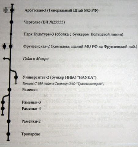 Существуют глубокие командные посты на территории Москвы. Один из них находится под Кремлём. Советская пресса заметила существование огромного подземного правительственного бункера рядом с Московским Государственным Университетом. Эти объекты предназначены для национального командования во время войны. Они находятся на глубине предположительно 200-300 метров и рассчитаны, по оценкам, на 10000 человек. Специальная линия метро проходит между некоторыми точками Москвы и, возможно, VIP-терминалом во Внуковском аэропорту».