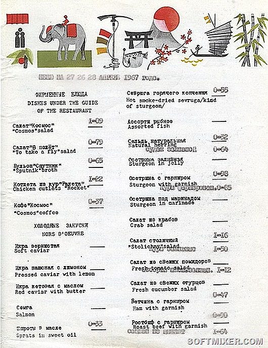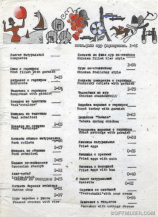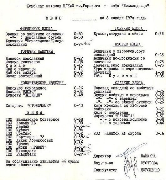 Да… Славное было время. На 10 рублей с человека можно было здорово погулять, познакомиться с девушками, натанцеваться до упада. А если ты после стройотряда… с 500-800 рублями «на кармане», то с шиком заказывать ансамблю песни, какие хочешь. В Москве можно было на 50 рублей пообедать с «боком осетра», например, в «Университетском», а в Ленинграде на 25 рублей целый день сидеть на Невском в «Кавказском». Славное время… автор же не жил тогда — вот и пишет всякую «совковую» чушь по америнструкциям о страшной жизни в «совке». одни только фото меню — правда.