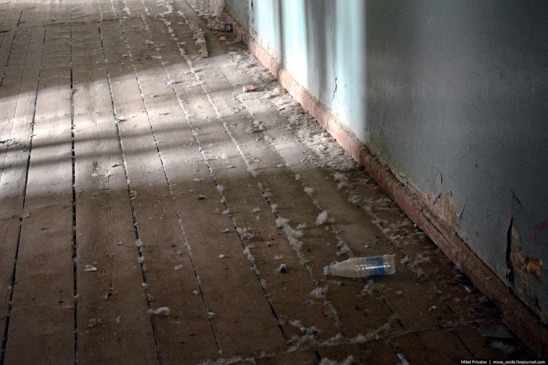 Третий этаж (правое крыло) — самое ушатанное. Влага которая проходит через дырявую крышу размачивает полы и в морозы замерзает. Такая картина во многих помещениях.