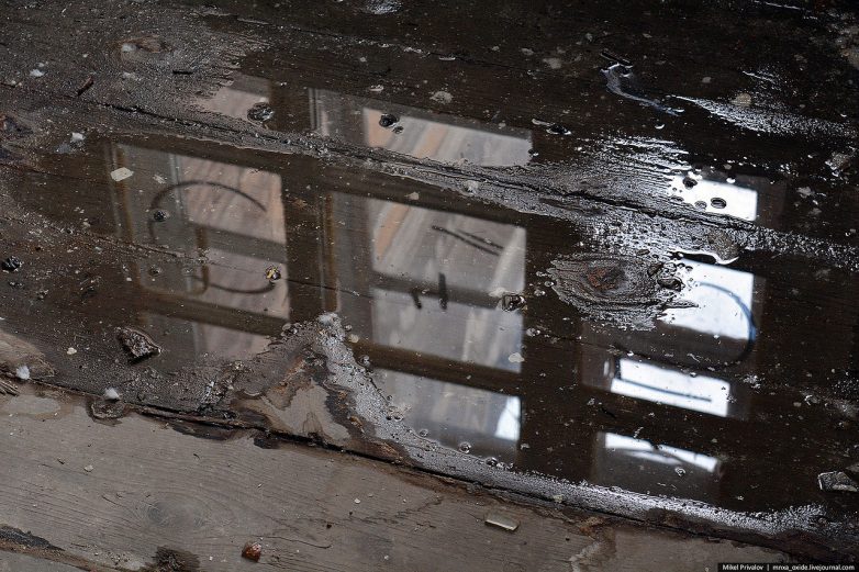 Идем по коридору третьего этажа. По скольку это крайний этаж, а крыша давно сгнила, тут все в лужах.