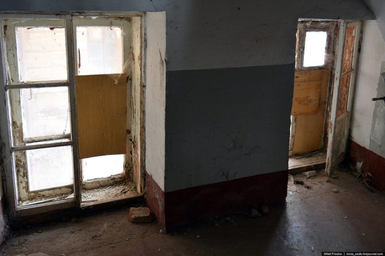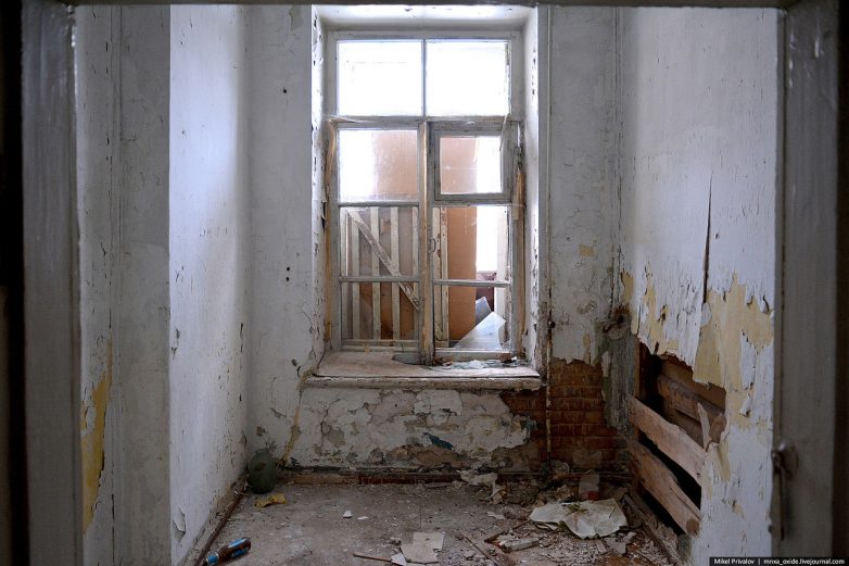 Батареи отопления теперь отсутствуют полностью (правда трубы еще не успели демонтировать) Первый этаж по периметру заколочен досками и металлическими листами. Но окна абсолютно не герметичны — вся влага и осадки легко проникают во внутрь.