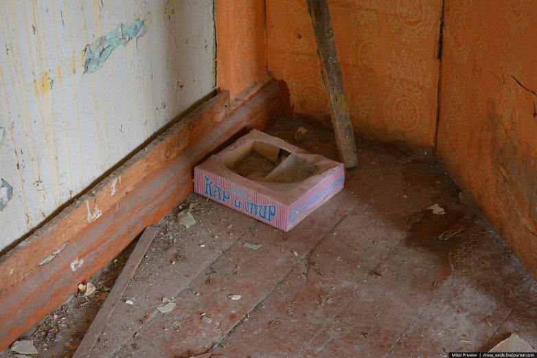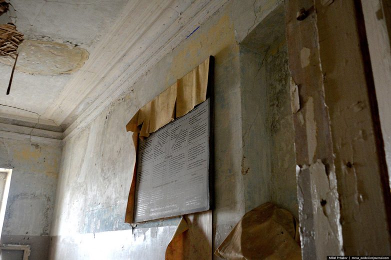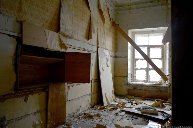 Отвалившиеся обои и развалившиеся стенные шкафы.