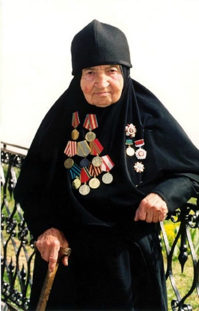 Прошла Великую Отечественную войну медсестрой, вынесла множество раненых бойцов с поля боя. “Я читала молитву, и страх как-то током в землю уходит. И слышно, как сердце бьется. И не боишься уже”. Укрывала раненых солдат от фашистов.
