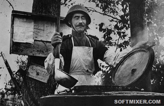 С вечера заливали в котле горох водой. Иногда горох заливали вместе с перловой крупой. На следующий день горох перекладывали в военно- полевую кухню и варили. Пока варился горох, в кастрюле на сале пережаривали лук и морковь. Если не было возможности делать зажарку, закладывали так. По мере готовности гороха добавлялась картошка, затем зажарка и в последнюю очередь закладывалась тушенка.