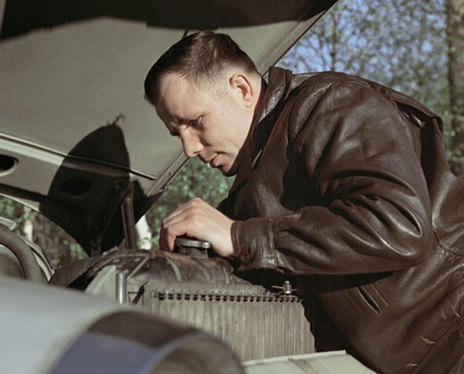 Гагарин занимается ремонтом автомашины. Александр Моклецов, 1963: