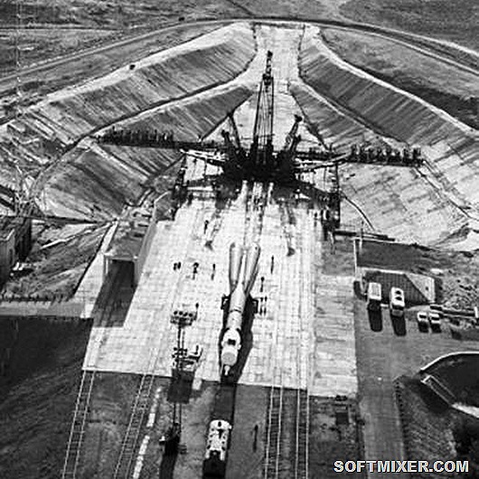 Пилотируемый космический корабль Союз-18 перед стартом на космодроме Байконур в Казахстане