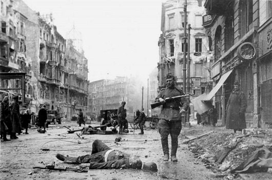Советский солдат идет мимо убитого гауптштурмффюрера СС.