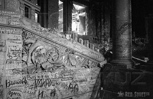 Автограф советских солдат на колонне Рейхстага: «Мы в Берлине! Николай, Петр, Нина и Сашка. 11.05.45 г.».