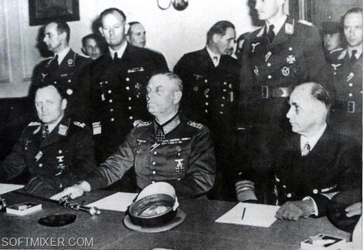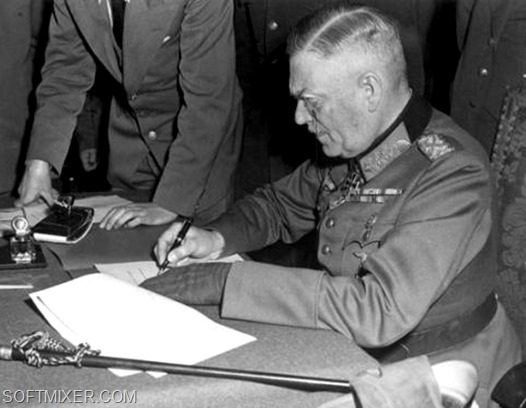 Генерал-полковник Альфред Йодль подписывает Акт о капитуляции в Реймсе.