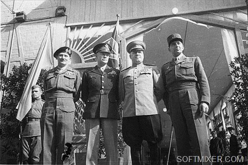 Иван Алексеевич Суслопаров (крайний слева) после подписания «Предварительного протокола о капитуляции Германии».