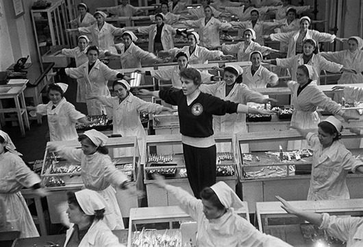Производственная гимнастика, как и многое в СССР, было добровольно-принудительным занятием. Всех рабочих, от доярок до сварщиков, под команды, доносившиеся из радиоприемника, заставляли приседать и бегать на месте.
