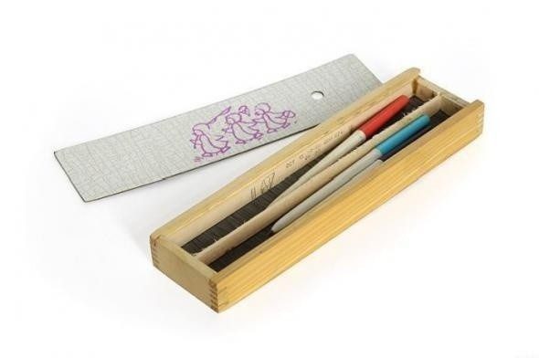 15. Набор для уроков по черчению — фанерная коробка-подставка, куда прикреплялся специальными кнопками лист бумаги, ассортимент линеек и карандашей с разной степенью твердости.