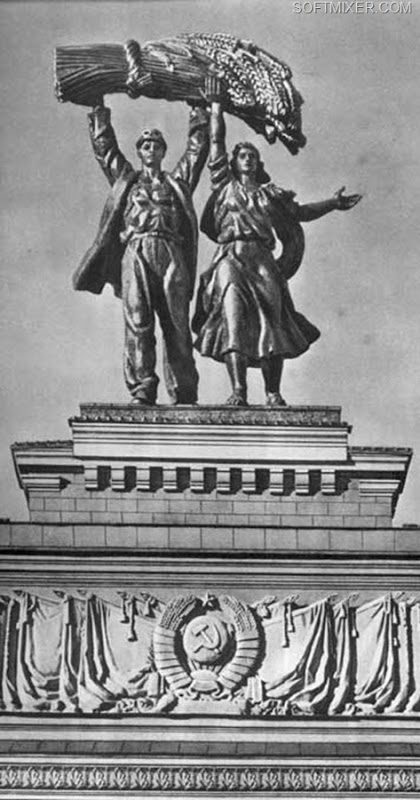 Эмблемой же Всесоюзной сельскохозяйственной выставки стала грандиозная скульптурная группа, изображающая тракториста и колхозницу, высоко поднявшим над головами золотистый сноп пшеницы. Она была установлена на 50 метровой башне Главного павильона, который представлял собой монументальное белое здание с красивой колоннадой. Фасад здания украшали гербы союзных республик и герб Советского Союза.