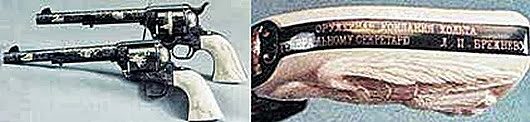 Подарок Брежневу от американских оружейников — два эксклюзивных револьвера с заводскими номерами ЛИБ-1 (Леонид Ильич Брежнев-1) и ЛИБ-2. Украшенные богатой гравировкой, отделанные золотом и слоновой костью, они сами по себе — произведение искусства. На рукоятке надпись на русском: «Оружейная компания Кольта Генеральному секретарю Л. И. Брежневу»